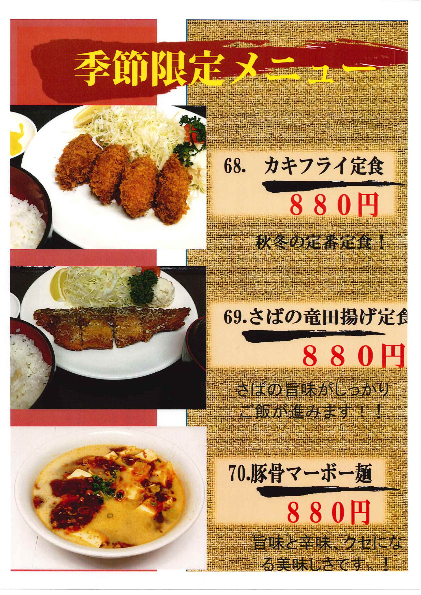 | 65、各定食おかずのみ | 750円 |
